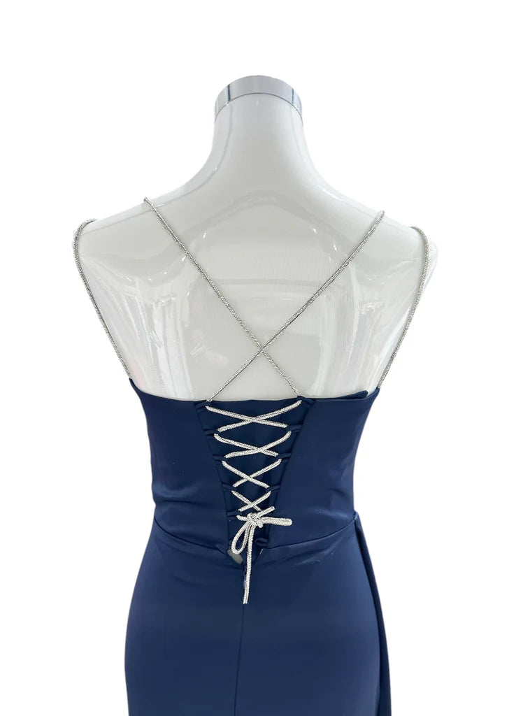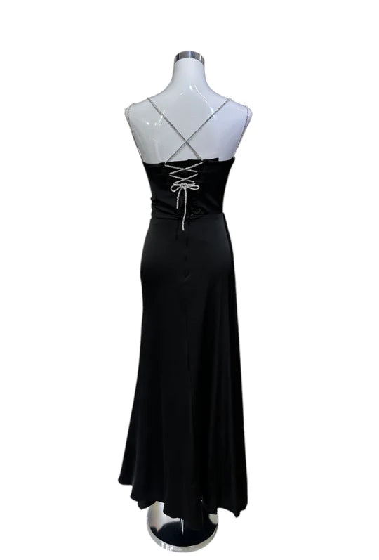 Élégante et sophistiquée, cette robe longue met en valeur la silhouette grâce à sa coupe fluide et ses détails raffinés. Son bustier drapé croisé souligne délicatement le décolleté, tandis que la taille cintrée et la jupe fendue sur le côté apportent une touche de glamour. Les fines bretelles ornées de strass ajoutent une note scintillante et féminine, idéale pour une cérémonie, un gala ou une soirée chic.