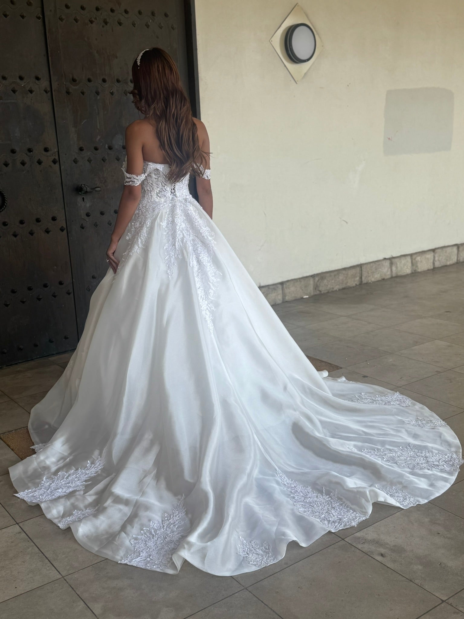 Dos ouvert avec traîne longue, soulignée de motifs brodés jusqu'à l’ourlet