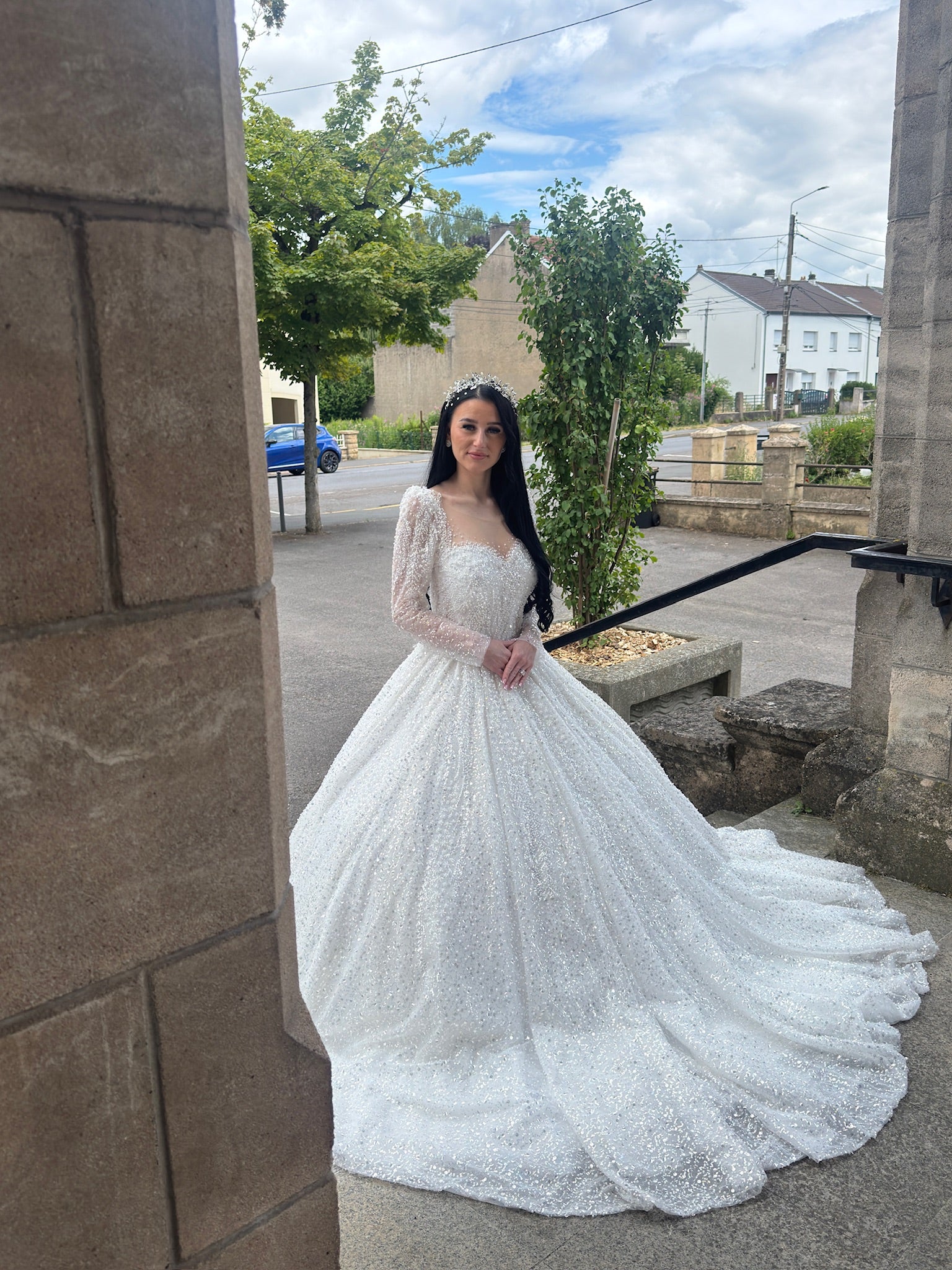 Laissez-vous éblouir par cette robe de mariée à manches longues, une véritable œuvre d’art aux reflets étincelants. Parfaite pour celles qui rêvent d’une allure de reine sous les projecteurs.