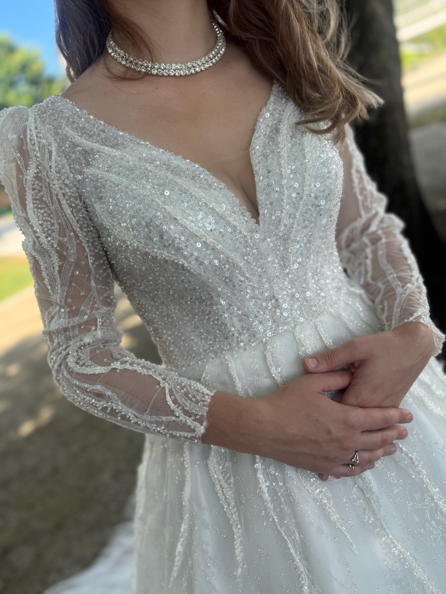 Robe de mariée scintillante à manches longues transparentes